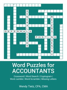 Word Puzzles for Accountants. All the word puzzles in this book relate to basic financial and managerial accounting. Contains more than 100 puzzles. Topics include the accounting cycle, job costing, inventory accounting, financial statement analysis, and more. Puzzles include crossword puzzles, word searches, cryptograms, word jumbles, word scrambles, and missing letter puzzles. The accounting knowledge needed for these puzzles comes from what it typically taught in basic introductory financial and managerial accounting courses.